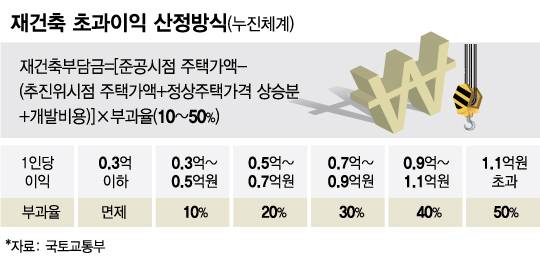 국토부는 대신 2006년 제도 시행 이후 한 번도 바꾸지 않은 부담금 면제금액(現 3000만원)을 상향하고 부과율 구간도 확대하겠단 계획이다. 의원 발의안대로 초과이익 중 1억원까지는 부담금 납부를 면제해주고 10~50%까지 차등 적용하는 부과율 구간도 3000만원~1억1000만원 초과구간에서 1억~2억2000만원 초과 구간으로 넓히는 방안이 유력하다.