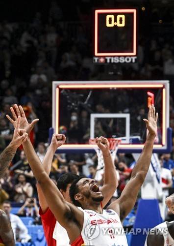 epa10192404 Spain's Sebastian Saiz celebrates with his teammates winning the FIBA EuroBasket 2022 Final basketball match between Spain and France in Berlin, Germany, 18 September 2022. EPA/FILIP SINGER