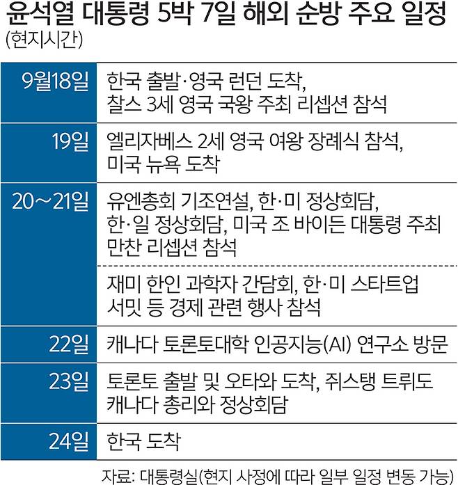 윤석열 대통령이 18일(현지시간) 5박 7일의 순방 일정 중 첫 방문지인 영국에 도착했다. 윤 대통령은 엘리자베스 2세 영국 여왕 장례식 참석을 시작으로 첫 유엔총회 기조연설과 한·미, 한·일, 한·캐나다 정상회담 등 경제안보 강화와 자유민주주의 핵심 가치를 공유하는 연대에 초점을 맞춘 빡빡한 일정을 소화한다.