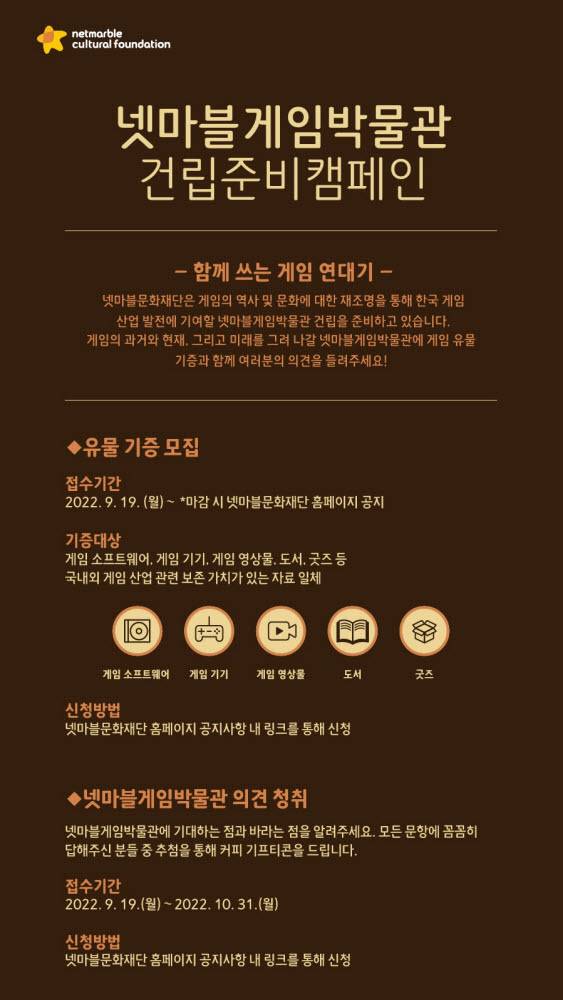 넷마블문화재단은 넷마블게임박물관에 대한 사전 의견을 청취하고 반영하기 위해 10월 31일까지 설문조사를 실시한다. 넷마블문화재단 홈페이지에서 참여 가능하며 참여자 중 추첨을 통해 커피 기프티콘을 제공한다.
