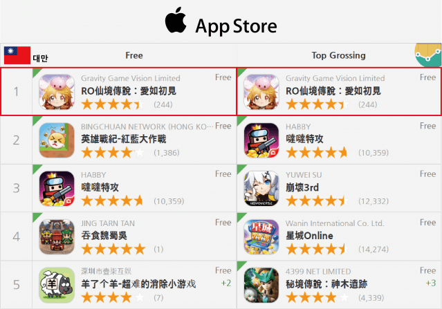 라그나로크 오리진은 9월 15일 대만, 홍콩, 마카오 지역 론칭 이후 3개 지역 애플 앱스토어에서 무료 인기 게임 순위와 매출 최고 순위 1위를 달성했다.