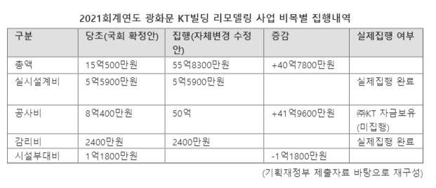 19일 파이낸셜뉴스 취재를 종합하면 기획재정부는 지난해 광화문 KT West사옥 빌딩 리모델링 사업 예산을 '국회 보고 없이' 자체적으로 40억원 늘렸다. 당초 국회에 제출된 '2021 회계연도 KT빌딩 리모델링 사업비'는 15억500만원이었으나, 기재부는 기금운용계획을 40억7800만원을 증액해 최종 55억8300만원을 공유지분권자 KT측 계좌에 입금했다.