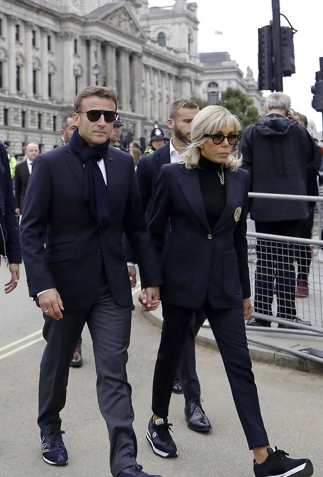 | ▲ 마크롱 프랑스 대통령과 배우자 브리짓 마크롱 여사가 18일 런던에서 엘리자베스 2세 영국 여왕을 추모하기 위해 웨스트민스터 홀에 걸어서 도착하고 있다. |