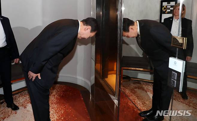 [런던=뉴시스] 홍효식 기자 = 윤석열 대통령이 19일(현지시간) 런던 한 호텔에서 열린 한국전 참전용사 국민포장 수여식을 마친 후 빅터 스위프트 영국 한국전참전용사협회 회장을 배웅하며 인사하고 있다. 2022.09.19. yesphoto@newsis.com