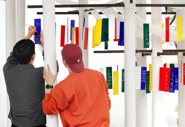 시청 앞 조형물에 형형색색 소원이 적힌 팻말이 붙어 있습니다. 색깔만큼 소원도 다양합니다. 그 소원, 전부 이뤄지기를.