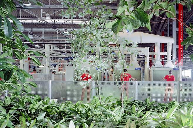 첫 인상은 놀라웠다. 수 많은 나무와 식물이 곳곳에 위치해 있고 온도와 습도는 적당해 쾌적했다. 거친 기계음도 잘 들을 수 없어 삭막한 공장보다 잘 가꿔진 식물원에 온 기분마저 들었다. 각 구역은 깔끔하게 나눠져 있으며 127대의 엔지니어링 기계가 설치돼 있다.
