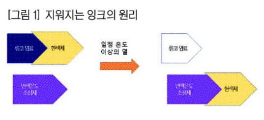 열 감지성 잉크의 재료는 ‘류코(leuco·흰색의, 무색의) 염료’ ‘현색제(顯色劑·developer)’ ‘변색 온도 조정제’로 구성돼 있다. 낮은 온도에서는 류코 염료와 현색제가 결합해 검은색으로 나타난다. 일정 온도 이상이 되면 변색 온도 조정제가 활성화돼 현색제와 류코 염료가 분리되고 변색 온도 조정제와 결합한다. 이때 잉크는 류코 염료의 원래 색인 투명한 색으로 변한다. [그림 1] 참조