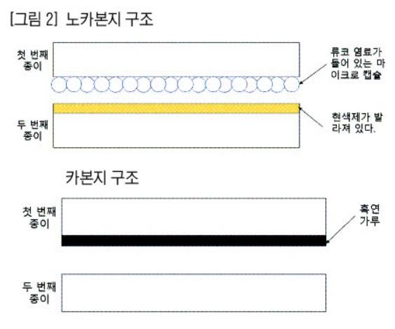 그렇다면 이름이 왜 노카본지(no-carbon paper)일까. 노카본지가 발명되기 전에는 종이 뒷면에 ‘카본(carbon·흑연)’을 바른 카본지를 사용해 글씨를 복사했다. 우리가 흔히 ‘먹지’라고 부르는 종이인데, 현재도 간이영수증지 등에 사용되며 두 장의 종이가 겹쳐 있다. 첫 번째 종이의 뒷면에 흑연가루가 발라져 있으며, 연필이나 볼펜 등으로 첫 번째 종이에 글씨를 쓰면 압력에 의해 두 번째 종이 윗부분에 흑연이 옮겨붙어 동일한 글씨가 써진다.