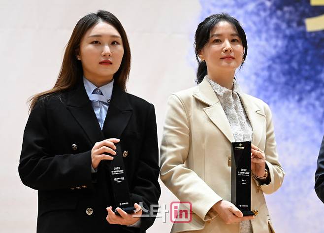 [이데일리 스타in 노진환 기자] 20일 오전 서울 여의도 국회 의원회관에서 열린 사단법인 국가브랜드진흥원 주최 '2022 국가브랜드 컨퍼런스'에서 스포츠 부문 대상을 수상한 쇼트트랙 선수 최민정(왼쪽)과 한류공로상을 수상한 배우 이영애가 기념촬영을 하고 있다.