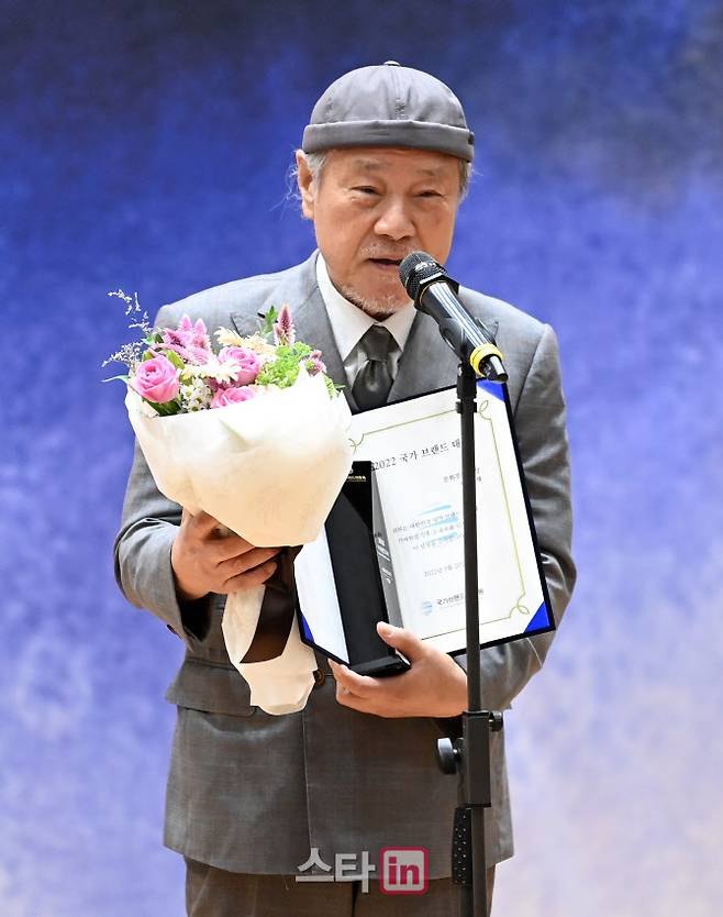 [이데일리 스타in 노진환 기자] 20일 오전 서울 여의도 국회 의원회관에서 열린 사단법인 국가브랜드진흥원 주최 '2022 국가브랜드 컨퍼런스'에서 코로나19로 불참한 배우 이정재의 문화 분야 대상을 대리수상한 이장호 감독이 소감을 전하고 있다.