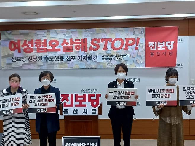 | ▲ 진보당 울산시당이 20일 오후2시 울산시의회 프레스센터에서 기자회견을 갖고 "스토킹범죄에 대한 '반의사불벌죄'를 폐지하여 가해자를 무조건 처벌하라"고 요구했다. |