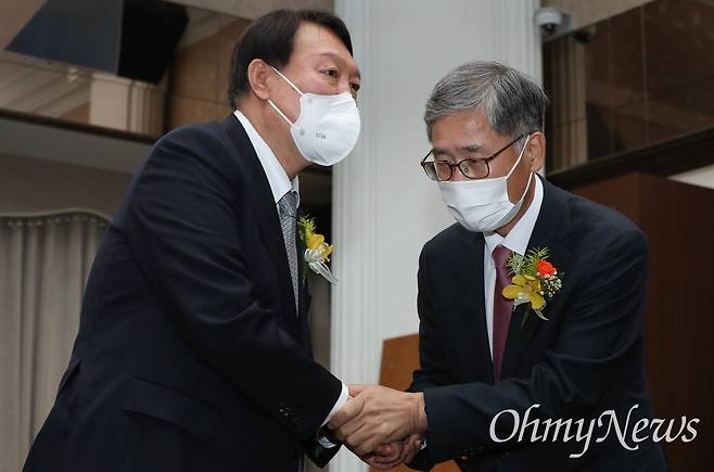 | ▲ 지난해 11월9일 당시 국민의힘 윤석열 대선후보가 서울 중구 한국프레스센터에서 열린 신평 변호사(오른쪽)의 출판기념회에 참석해 신 변호사와 악수하는 모습. |