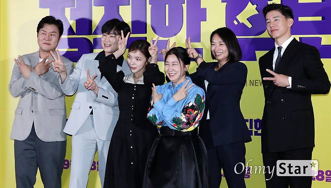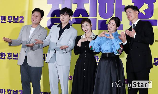 윤경호, 서현우, 박진주, 라미란, 김무열 배우와 장유정 감독(오른쪽에서 두 번째)이 20일 오후 서울 강남구의 한 상영관에서 열린 영화 <정직한 후보2> 시사회에서 포토타임을 갖고 있다.
