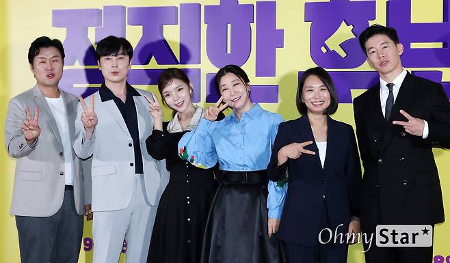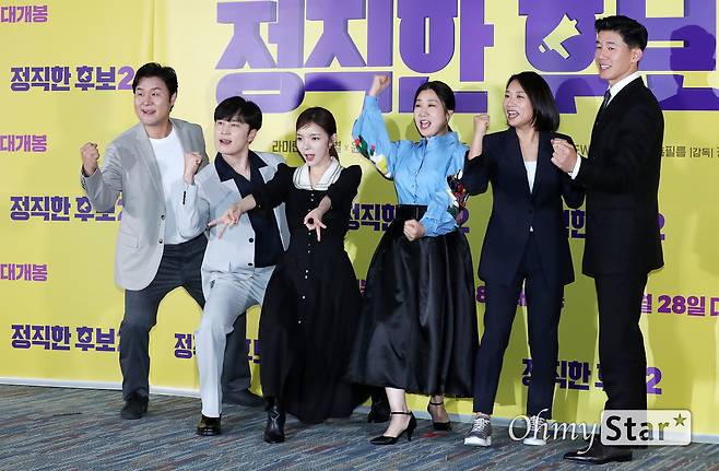 윤경호, 서현우, 박진주, 라미란, 김무열 배우와 장유정 감독(오른쪽에서 두 번째)이 20일 오후 서울 강남구의 한 상영관에서 열린 영화 <정직한 후보2> 시사회에서 포토타임을 갖고 있다. 정직한>