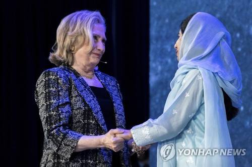 Hillary Clinton speaks to Malala Yousafzai at the Clinton Global Initiative, Tuesday, Sept. 20, 2022, in New York. (AP Photo/Julia Nikhinson)