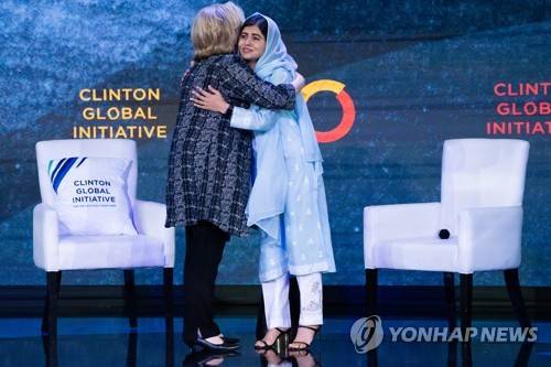 Malala Yousafzai greets Hillary Clinton at the Clinton Global Initiative, Tuesday, Sept. 20, 2022, in New York. (AP Photo/Julia Nikhinson)
