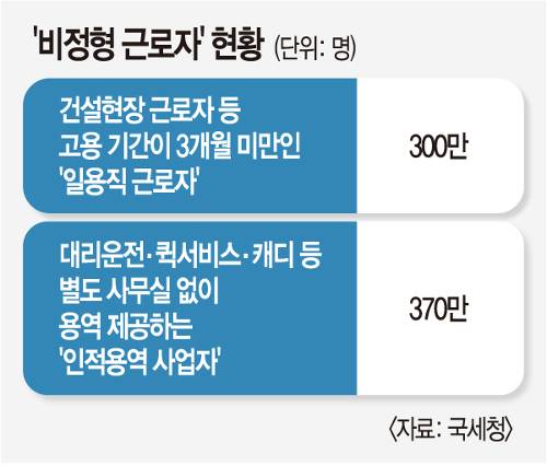 국세청은 비정형 근로자로 구분되는 이들이 670만명에 달한다고 20일 밝혔다. 이 중 300만명은 건설현장 근로자 등 일용 근로자로 분류된다. 나머지 370만명은 대리운전·퀵서비스 기사, 캐디 등 별도 사무실 없이 용역을 제공하는 인적 용역 사업자인 것으로 파악됐다.