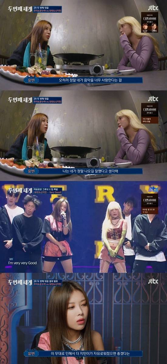 20일 방송된 JTBC 예능 프로그램 '두 번째 세계'에는 '2'라는 주제로 두 명씩 유닛을 이룬 유닛들의 무대가 담겼다. 이날 유빈과 신지민은 한 팀이 돼 유닛 무대를 준비했다.
