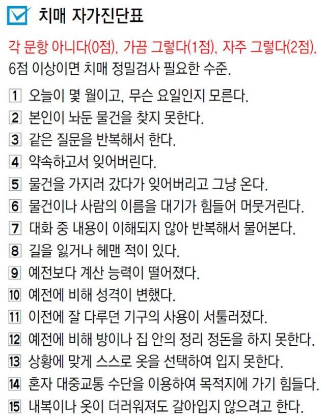 치매의 증상은 다양한데 기억을 못 하거나 사실 자체를 잊는 등 사건 전체에 대해 기억하지 못하는 경우 치매 또는 인지 기능 장애의 초기 증상일 수 있다. 치매는 기억력 감퇴와 함께 다른 증상이 동반될 가능성이 크다. 성격이 변하거나 언어, 시간, 공간, 지각 능력 등이 함께 저하되는 경우가 많다. 전문가들은 치매 자가진단표에서 6점 이상이 나온다면 치매 정밀검사를 받아봐야 한다고 권고한다.
