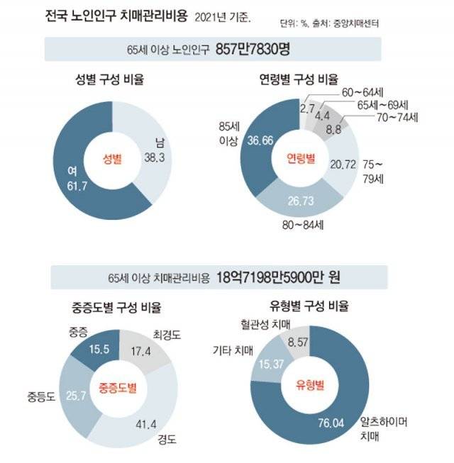 치매 환자 관리를 위한 비용도 꾸준히 증가하고 있다. 65세 이상 치매 환자 1인당 연간 관리 비용은 2011년 1851만 원에서 지난해 2072만 원으로 늘었다. 지난해 기준 60세 이상 치매 환자에 들어가는 연간 관리 비용은 20조 원에 육박한다.