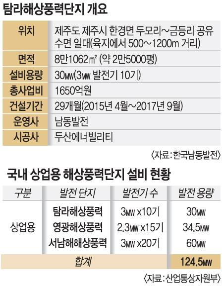 제주시 한경면 두모리와 금등리 일대에 있는 이곳은 국내 최초의 상업용 해상풍력단지인 ‘탐라해상풍력발전단지’로 한국남동발전이 운영하고 있다. 전체 설비용량은 30㎿(메가와트)로 3㎿짜리 발전기 10기가 전체 8만1062㎡(약 2만5000평) 면적의 바다에 300m 간격으로 일렬횡대를 이루고 있었다.