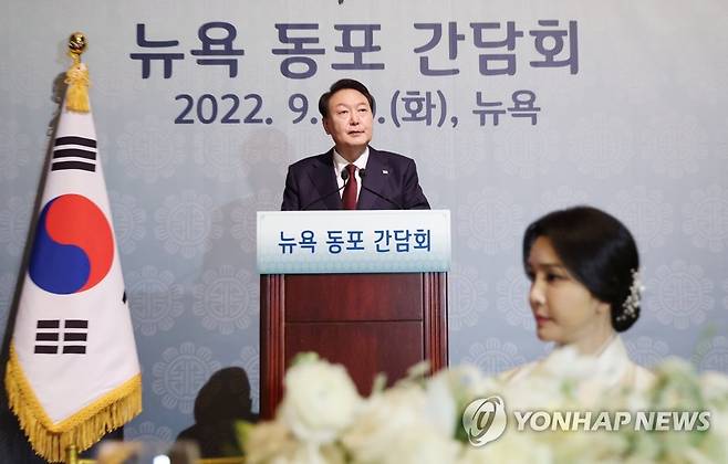 (뉴욕=연합뉴스) 안정원 기자 = 윤석열 대통령이 20일(현지시간) 미국 뉴욕 시내 한 연회장에서 열린 동포간담회에서 격려사를 하고 있다. 2022.9.21