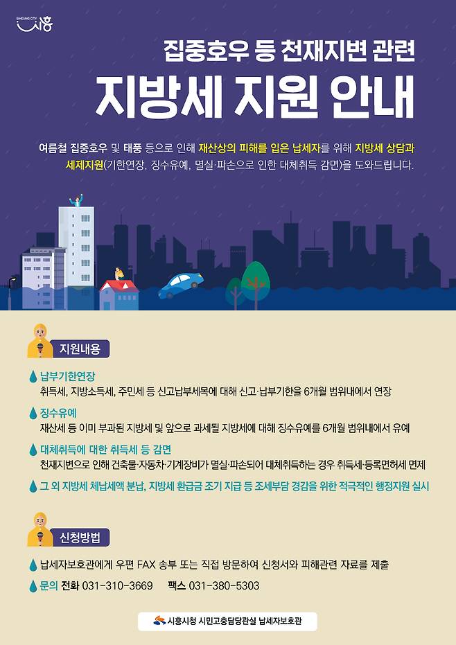 지방세 지원을 받고자 하는 시민은 피해사실확인서 등 관련 서류를 첨부해 시흥시청 납세자보호관(031-310-3669)이나 시흥시청 세정과 및 징수과로 신청하면 된다.