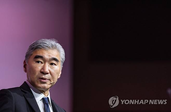 (서울=연합뉴스) 황광모 기자 = 성 김 미 국무부 대북 특별대표(오른쪽)가 21일 오전 서울 중구 신라호텔에서 열린 매일경제 주최 세계지식포럼에서 '미국의 대북정책 방향 이해하기'를 주제로 국민의힘 태영호 의원과 대화하고 있다. 2022.9.21