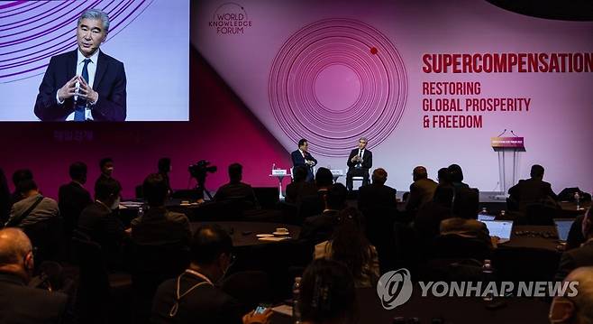 (서울=연합뉴스) 황광모 기자 = 성 김 미 국무부 대북 특별대표(오른쪽)가 21일 오전 서울 중구 신라호텔에서 열린 매일경제 주최 세계지식포럼에서 '미국의 대북정책 방향 이해하기'를 주제로 국민의힘 태영호 의원과 대화하고 있다. 2022.9.21