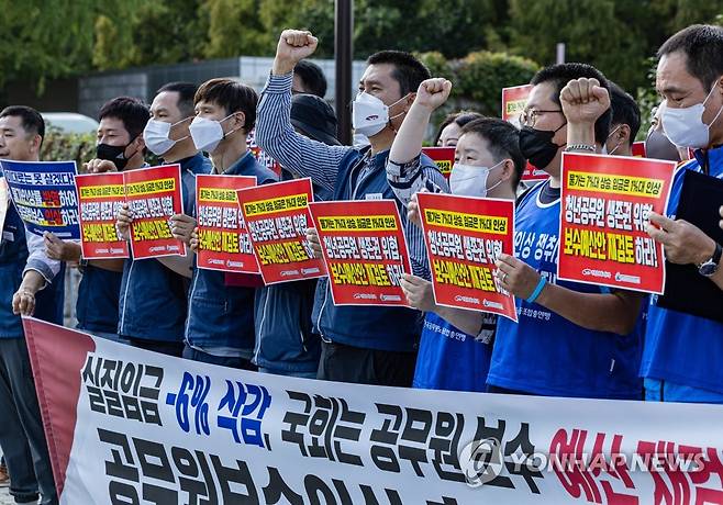 (서울=연합뉴스) 황광모 기자 = 21일 오후 서울 여의도 국회 앞에서 전국공무원노동조합과 대한민국공무원노동조합총연맹이 주최한 공무원 보수 인상 촉구 기자회견에서 참석자들이 정부가 국회에 제출한 공무원 보수 예산안에 대해 국회의 재검토를 촉구하는 구호를 외치고 있다. 2022.9.21