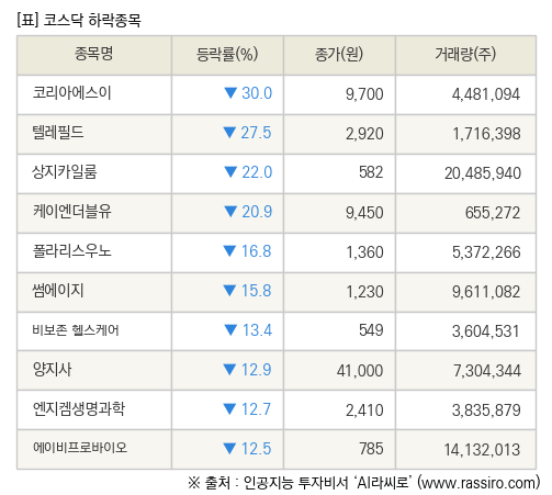 [fnRASSI]장마감, 코스닥 하락 종목(코리아에스이 -30.0% ↓)