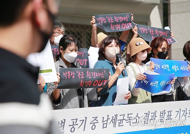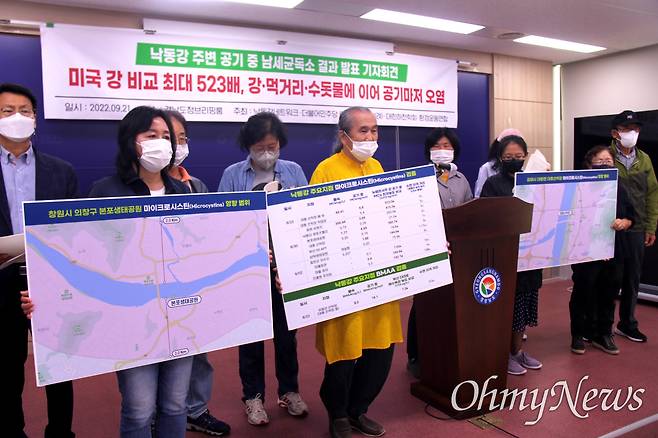 | ▲ 낙동강네트워크, 경남환경운동연합은 9월 21일 경남도청 프레스센터에서 기자회견을 열어 "낙동강 주변 공기 중 남세균 독소 조사 결과"를 발표했다. |