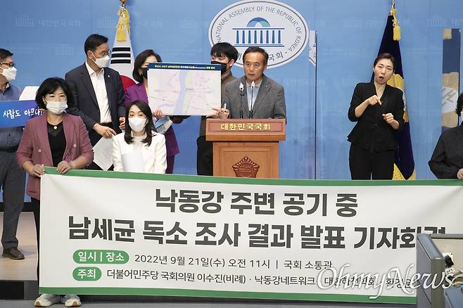 낙동강네트워크, 대한하천학회, 환경운동연합, 이수진 국회의원(더불어민주당)은 21일 국회, 부산광역시청, 경남도청, 대구시청에서 각각 기자회견을 열고 낙동강 주변 공기 중 남세균 독소 조사 결과를 발표했다.