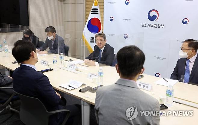 (서울=연합뉴스) 박보균 문화체육관광부 장관이 21일 서울 용산구 문체부 저작권보호과 서울사무소 회의실에서 지역신문 관계자들을 만나 간담회를 하고 있다. 2022.9.21 [문화체육관광부 제공. 재판매 및 DB 금지]