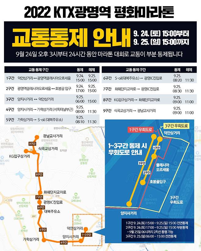 대회 전일인 24일 오후 3시부터 대회 당일인 25일 오전 6시까지 덕안삼거리(이케아)에서 광명역클래시아오르세움 앞 대로변에 이르는 구간이 전면 통제되며 통행 차량은 LH광명시흥지사 앞 도로 방면으로 우회해야 한다.