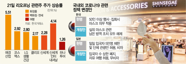 투자 온기는 백화점 및 면세점 관련주에서도 확인됐다. 신세계(004170)는 전날보다 5500원(2.28%) 오른 24만 6500원에 장을 마쳤다. 신세계인터내셔날(031430)도 전날(6%)에 이어 4% 상승세를 기록했다. 여행주인 하나투어(1.26%)도 2영업일 연속 상승했고 티웨이항공의 지주사인 티웨이홀딩스 주가도 소폭 올랐다.
