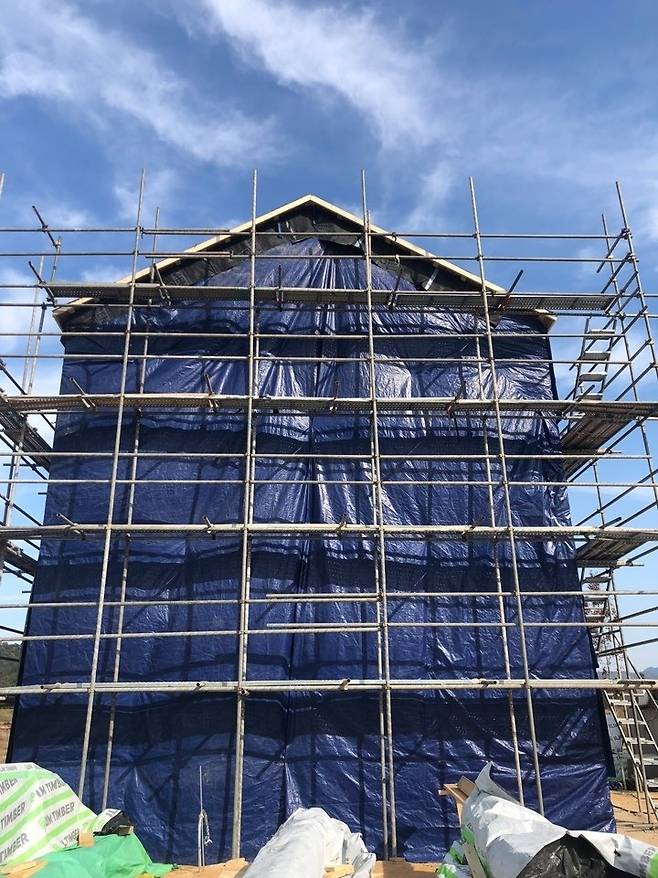 | ▲ 가랑비 예보에 '굳이' 집 전체를 천막으로 덮은 시공 현장 모습 |