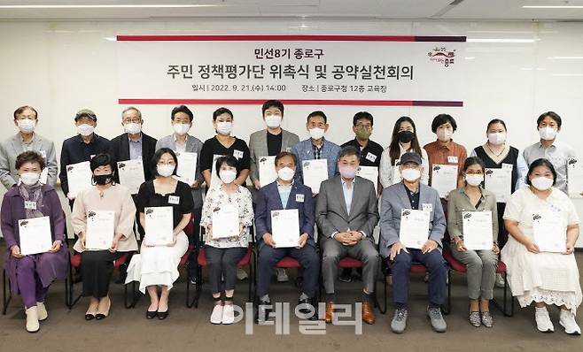정문헌(앞줄 오른쪽 네번째) 종로구청장이 21일 종로구청 교육장에서 열린 '민선 8기 종로구 주민 정책평가단' 위촉식 및 공약실천대회에서 참석자들과 기념촬영을 하고 있다.