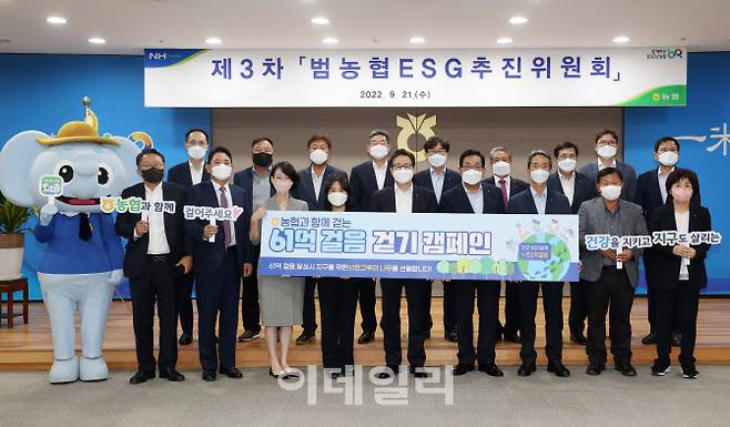 [이데일리 김태형 기자] 이재식(앞줄 오른쪽 다섯번째) 농협중앙회 부회장과 범농협 ESG 추진위원들이 21일 서울 중구 농협 본관에서 ESG 실천을 위한 '농협과 함께 걷는 61억 걸음 걷기' 캠페인을 하고 있다.