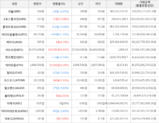 또한, 칠리즈(-5.01%, 322원), 알고랜드(-3.63%, 451원), 리플(-3.25%, 566원), 카이버네트워크(-2.43%, 1,805원), 이더리움클래식(-1.31%, 40,720원), 룸네트워크(-0.26%, 77.8원)가 하락세를 나타냈다.