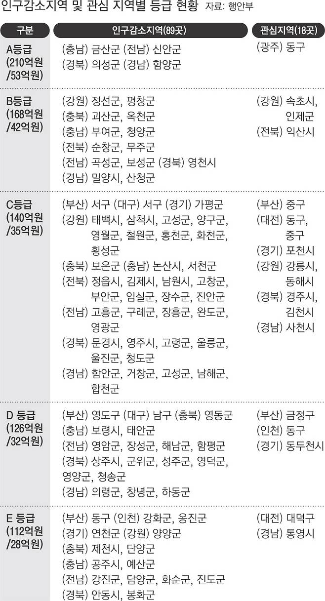 행안부는 소멸기금을 배분하면서 ‘연계·협력’과 ‘기초지자체 간 경쟁’에 중점을 뒀다고 밝혔다. 소멸기금 배분액이 기초지자체별로 크지 않은 만큼, 기존 사업에 소멸기금을 보태 쓰는 형태의 사업계획을 높게 평가했다고 한다.
