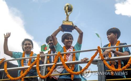 epa10196899 Bangladesh Women's football team members wave to supporters from an open-top bus during their victory parade in Dhaka, Bangladesh, 21 September 2022. The Bangladesh Women's football team won the SAFF Women's Championship 2022 in Nepal. EPA/MONIRUL ALAM