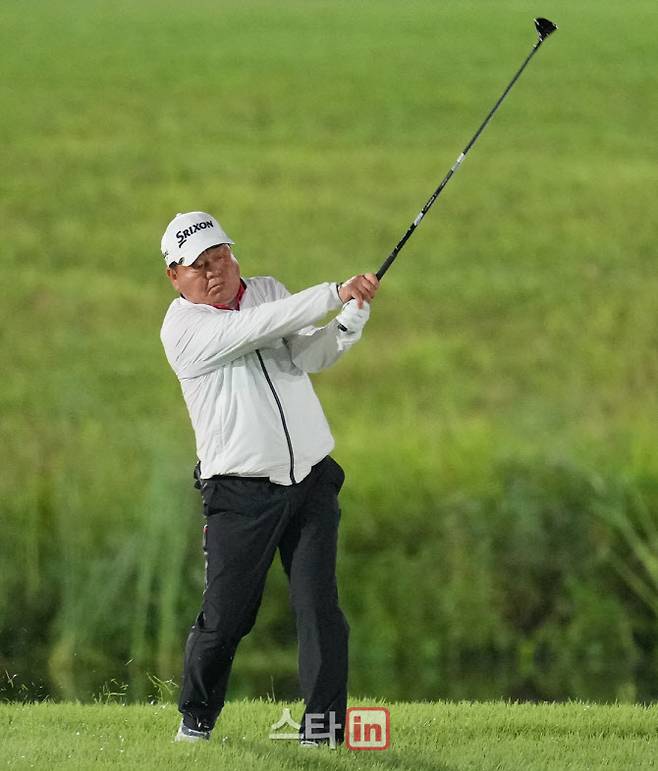 [이데일리 골프in(김천)=조원범 기자]21일 김천시 구성면에 위치한 김천포도CC(파72.6790야드)에서 '제2회 머스코 문라이트 KPGA 시니어 오픈'1라운드가 열렸다.이번 대회는 야간에 개최되는 프로골프투어(KPGA) 경기로 머스코의 명품 LED조명이 골프장에 설치되었다.장인규의 16번홀 경기 장면.