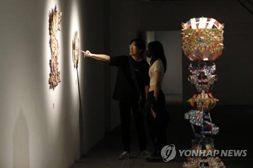 epa10196976 Visitors look at an artwork displayed in the 'The Foliage IV' exhibition at Vincom Center for Contemporary Art (VCCA) in Hanoi, Vietnam, 21 September 2022. The exhibition with 26 artists featuring nearly 40 artworks, opens to the public from 16 September to 30 November. EPA/LUONG THAI LINH