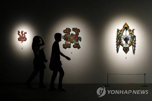 epa10196973 Visitors walk past an artwork displayed in the 'The Foliage IV' exhibition at Vincom Center for Contemporary Art (VCCA) in Hanoi, Vietnam, 21 September 2022. The exhibition with 26 artists featuring nearly 40 artworks, opens to the public from 16 September to 30 November. EPA/LUONG THAI LINH