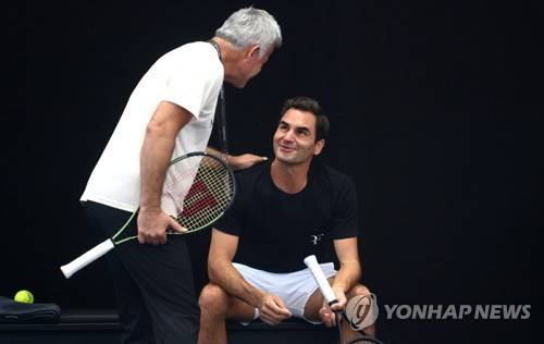 epa10196983 Roger Federer (R) of Switzerland speaks to Apostolos Tsitsipas, father of Greek player Stefanos Tsitsipas, during a practice session in London, Britain, 21 September 2022, ahead of the Laver Cup tennis tournament starting on 23 September. On 15 September announced his retirement from professional tennis with the Laver Cup his last tournament he will play in. EPA/ANDY RAIN