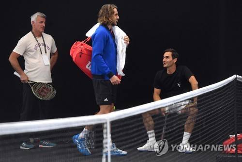 epa10196985 Roger Federer (R) of Switzerland speaks to Greek player Stefanos Tsitsipas, accommpanied by his father Apostolos Tsitsipas (L), during a practice session in London, Britain, 21 September 2022, ahead of the Laver Cup tennis tournament starting on 23 September. On 15 September announced his retirement from professional tennis with the Laver Cup his last tournament he will play in. EPA/ANDY RAIN