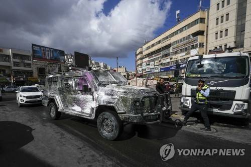A damaged Palestinian security forces armored vehicle is seen a day after violent clashes between Palestinians militants and Palestinian security forces in the West Bank city of Nablus, Wednesday, Sept. 21, 2022. Authorities in the city of Nablus in the occupied West Bank announced that a truce has been reached to end violent clashes between militants and Palestinian security forces. (AP Photo/Majdi Mohammed)