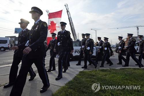 Police officers arrive for the funeral of Toronto police Const. Andrew Hong in Toronto on Wednesday, Sept. 21, 2022. Const. Hong was killed while at a coffee shop in Mississauga, Ontario, on Monday before the same suspect killed an auto shop owner in Milton, Ontario, later that day. (Frank Gunn/The Canadian Press via AP) MANDATORY CREDIT