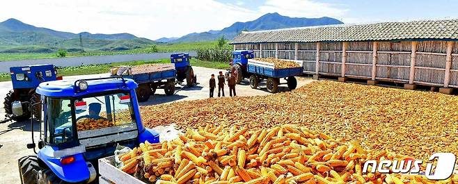 (평양 노동신문=뉴스1) = 북한 노동당 기관지 노동신문은 22일 "가을철 영농사업을 힘있게 추진하자"라고 촉구했다. 사진은 옥수수를 수확 중인 봉산군.